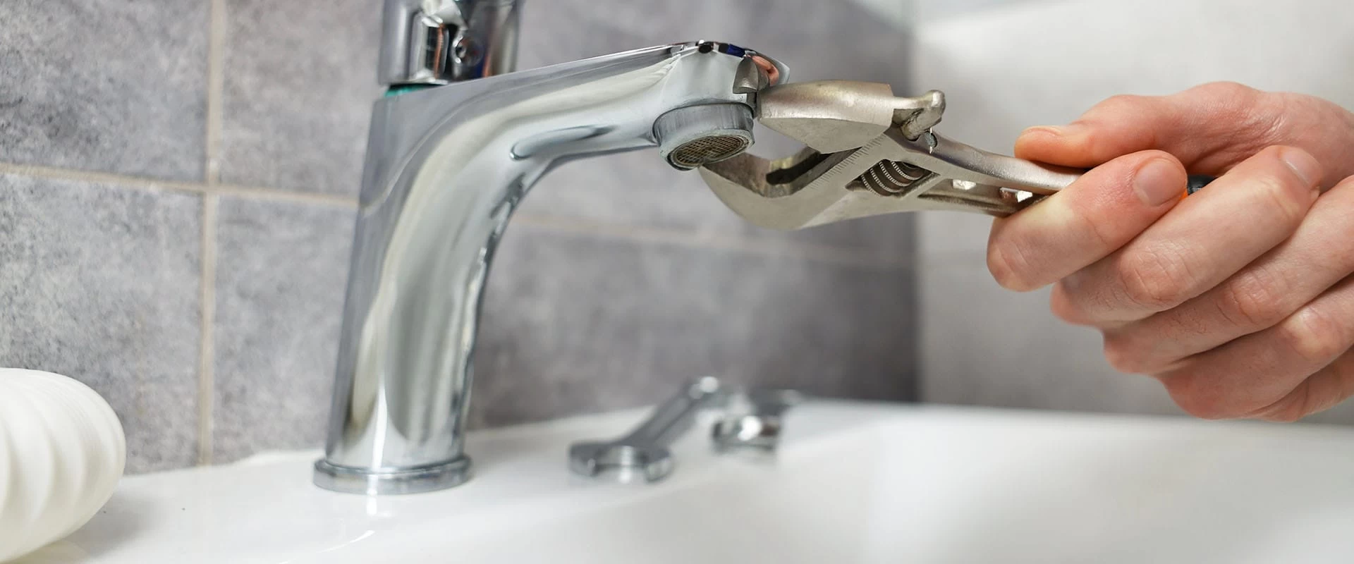 A kitchen sink with a chrome faucet is shown. Nearby, pliers, an adjustable wrench, and a replacement faucet part suggest faucet repair—perfect for those seeking plumber services in El Dorado, CA.